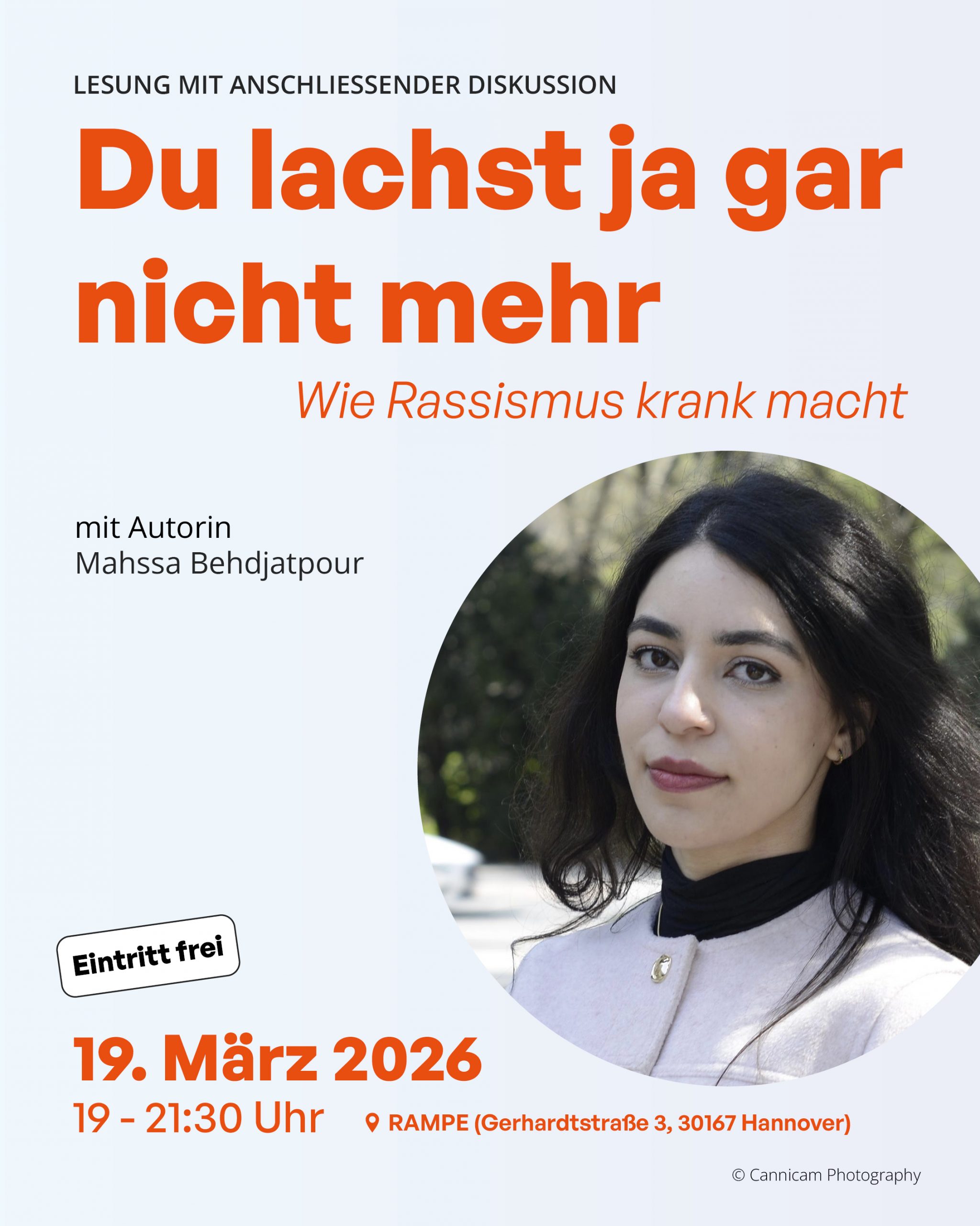 Termin: 19. März 2026, 19:00 – 21:30 Uhr Ort: RAMPE (Gerhardtstraße 3, 30167 Hannover) Mahssa Behdjatpour wuchs in Hannover auf und erlebte im Kindergarten, in der Schule sowie im Studium Rassismus. Ihre Erlebnisse...